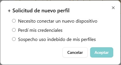 Al seleccionar "Perdí mis credenciales" o "Sospecho uso indebido de mis perfiles", aparecerá una ventana donde podrás: